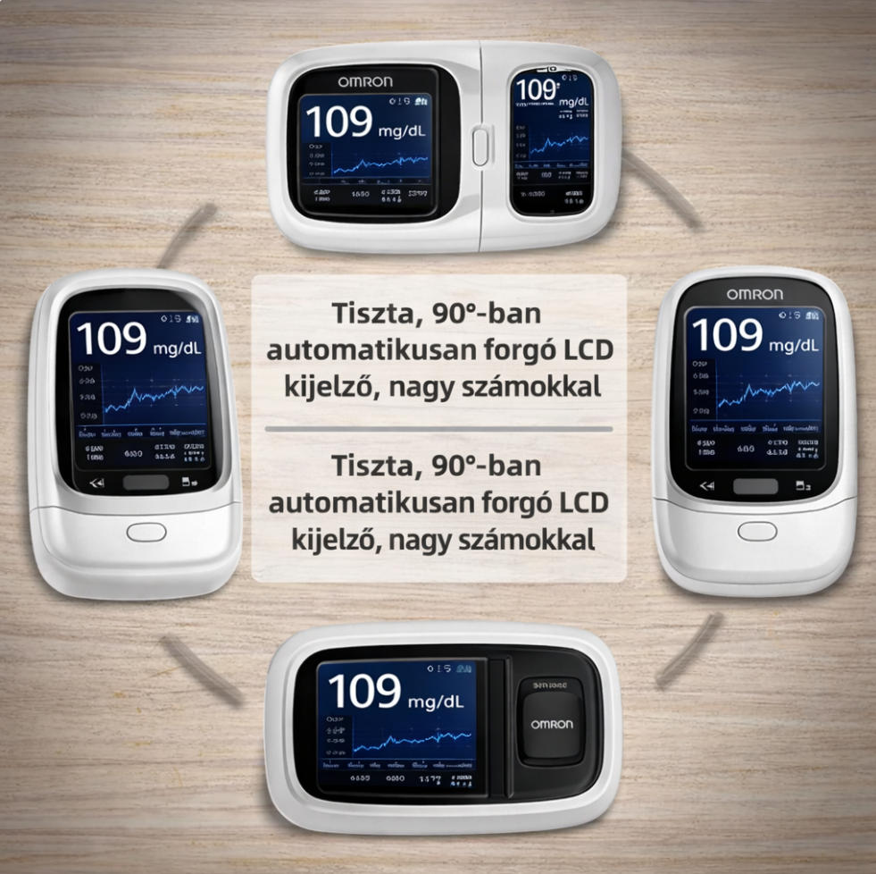 Bekapcsolás után az Omron™ készülék minden egyes bekapcsológomb-megnyomáskor automatikusan vált a kijelző módok között, így az értékek bármilyen szögből kényelmesen olvashatók.